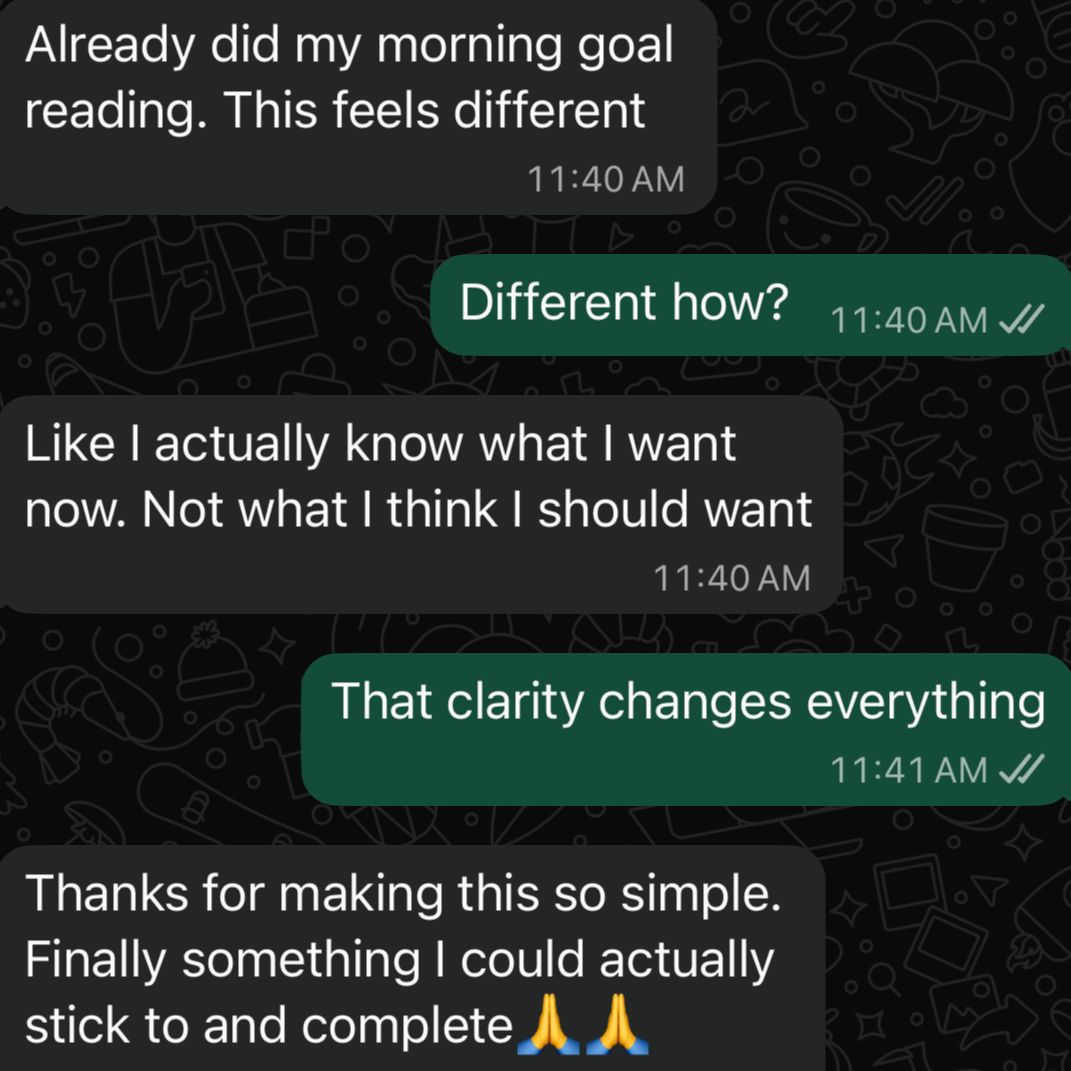"I've tried so many goal-setting methods, but this is the first one I've actually completed and stuck with. The NPA/PA framework was a game-changer for identifying what was really holding me back."